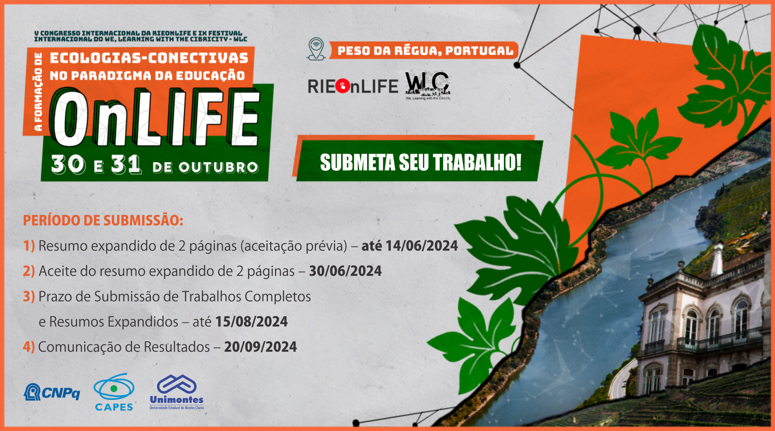 NoticiasEstão abertas as submissões de trabalho para o V RIEOnLIFE e IX We, Learning with the Cibricity (WLC) Noticias / Jeferson / 6 de junho de 2024