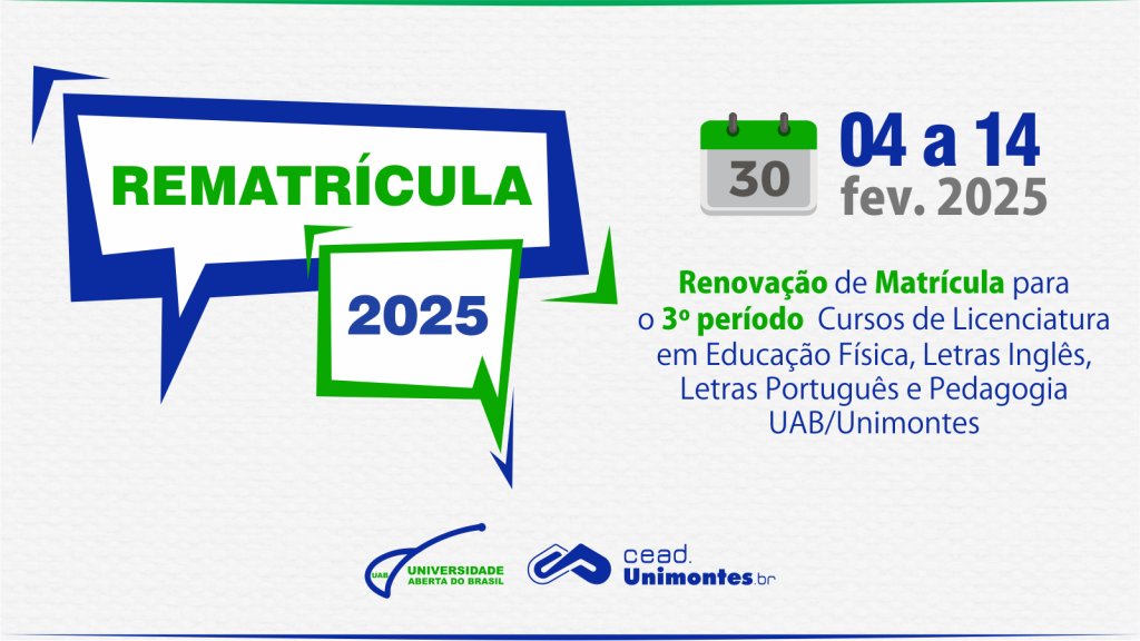 Noticias, Principal 2PRORROGADO! Renovação da matrícula para o 3º Período dos Cursos de Licenciatura da UAB/Unimontes começa em Fevereiro Noticias, Principal 2 / Tátylla Pimenta / 31 de janeiro de 2025