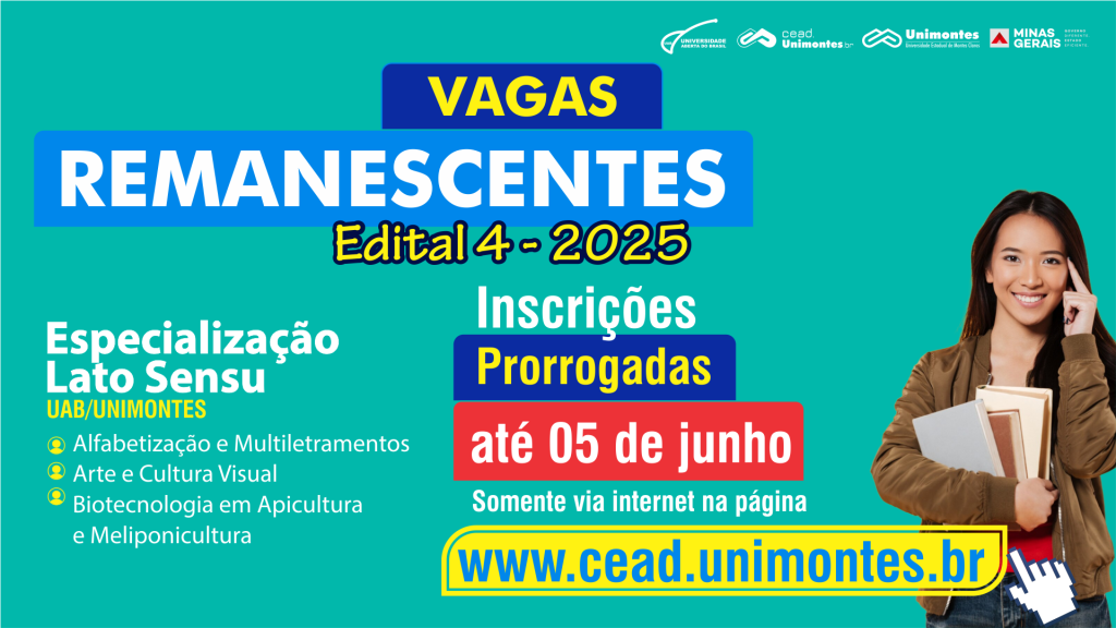 Noticias, PrincipalUAB/Unimontes abre inscrições para vagas remanescentes em cursos de pós-graduação a distância Noticias, Principal / Tátylla Pimenta / 15 de maio de 2025
