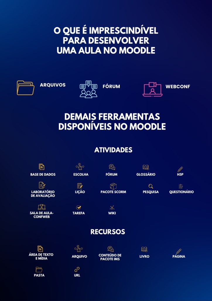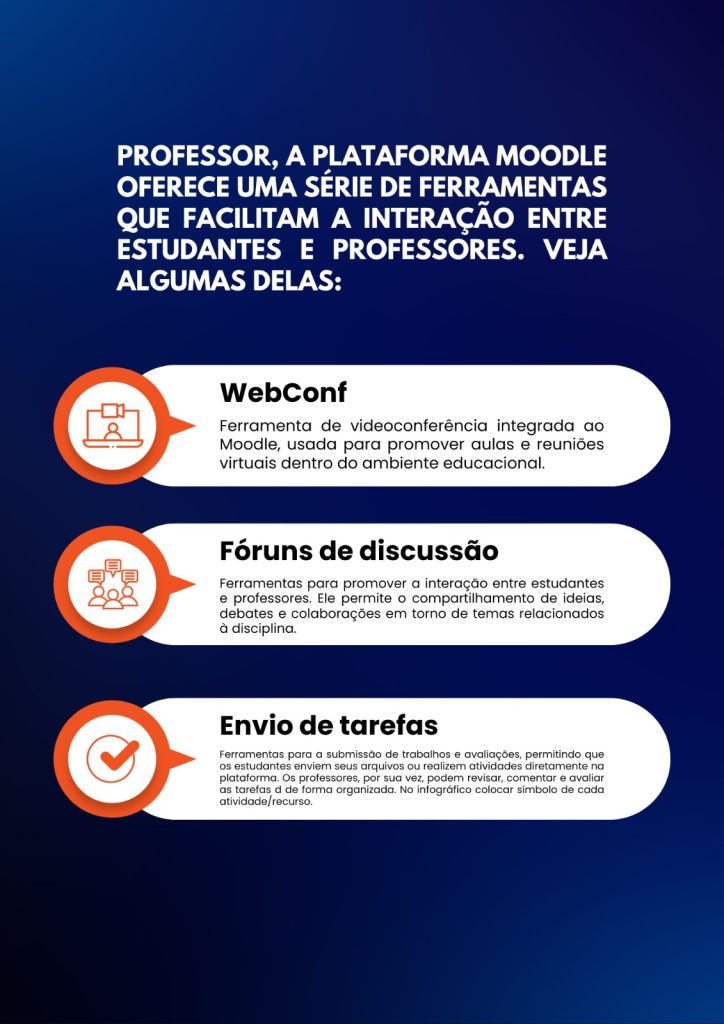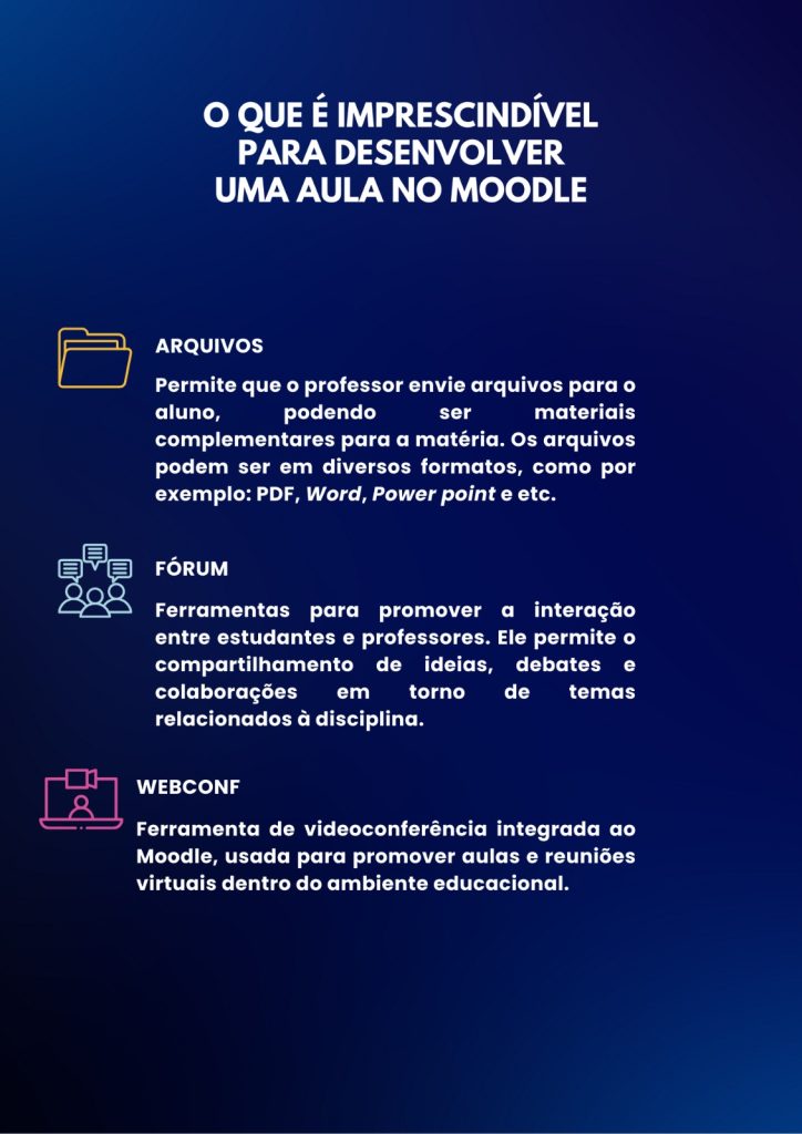 Explore as seções à esquerda para entender como acessar seus cursos, acionar os recursos de atividades das salas, agendar sessão de webconferência, lançar notas e muito mais. Este espaço foi criado para garantir que você tenha uma experiência de aprendizado tranquila e eficiente no Moodle.