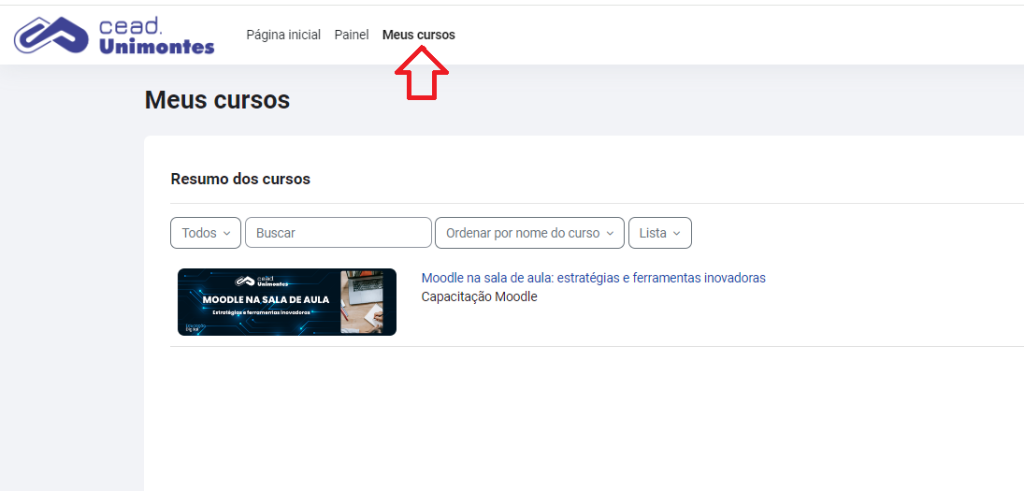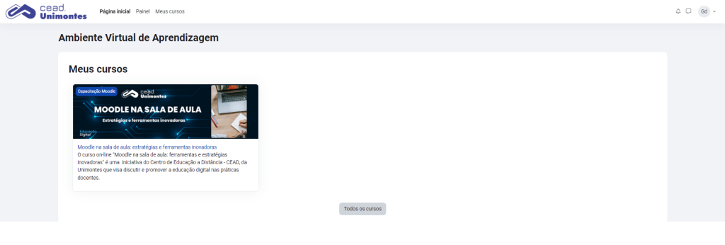 - Após o login, você será redirecionado para o seu Painel ou Página Inicial do Moodle, onde verá uma lista de todos os cursos em que está matriculado.