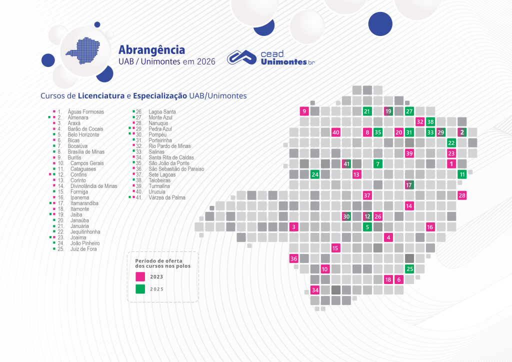 A EAD Unimontes está presente em mais de 41 polos em todo o Estado. Esses polos são definidos mediante articulação do mantenedor (Estado ou Município) com a Instituição de Ensino Superior (IES) pública que esteja credenciada no Sistema UAB. Tais polos oferecem uma infraestrutura física e tecnológica adequada para o acompanhamento dos cursos a distância e para apoio nas questões tecnológicas, administrativas e de orientação para os estudos.