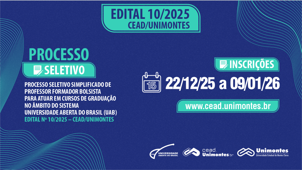 destaque, EditaisProcesso Seletivo Simplificado de Professor Formador Bolsista para Atuar em Cursos de Graduação no Âmbito do Sistema Universidade Aberta do Brasil (UAB) – Edital Nº 10/2025 – CEAD/UNIMONTES destaque, Editais / Editais / 15 de dezembro de 2025