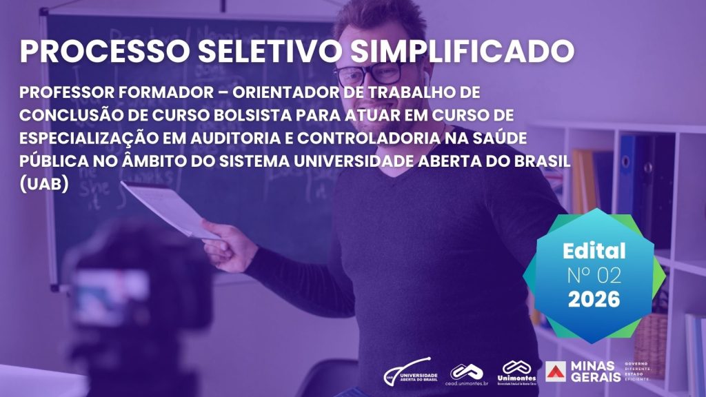 destaque, EditaisProcesso Seletivo Simplificado de Professor Formador – Orientador de Trabalho de Conclusão de Curso Bolsista para Atuar em Curso de Especialização em Auditoria e Controladoria na Saúde Pública no Âmbito do Sistema Universidade Aberta do Brasil (UAB) – Edital Nº 02/2026 – CEAD/Unimontes destaque, Editais / Editais / 10 de março de 2026