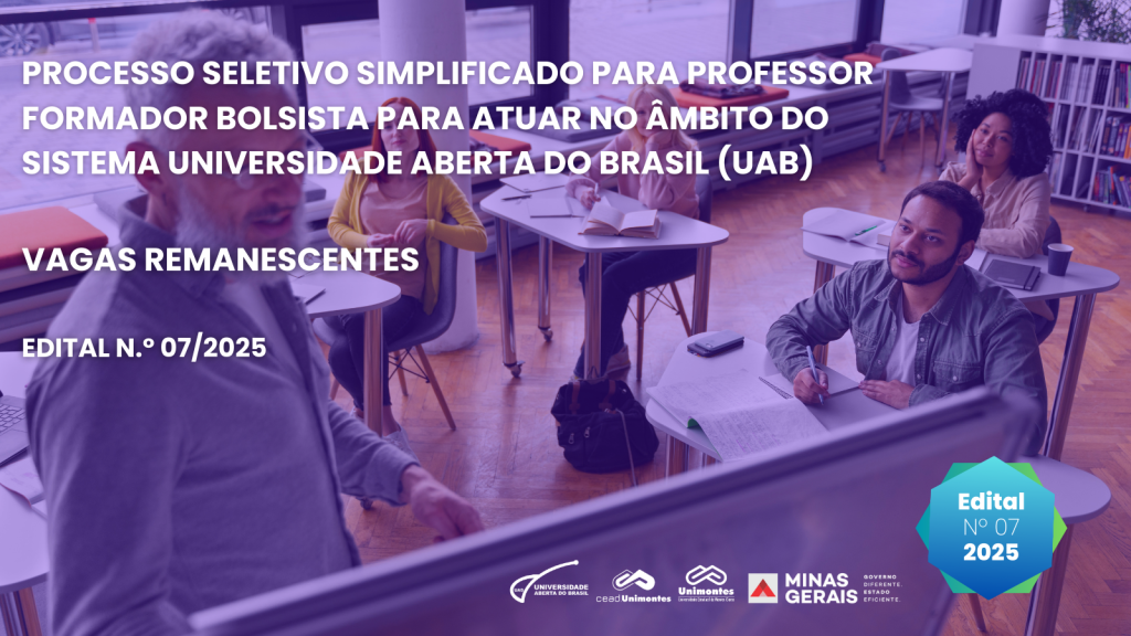 destaque, EditaisProcesso Seletivo Simplificado de Professora Formador Bolsista para Atuar em Curso de Especialização no Âmbito do Sistema Universidade Aberta do Brasil (UAB) – Edital N.º 02/2025 – CEAD/UNIMONTES – 2º Vagas Remanescentes destaque, Editais