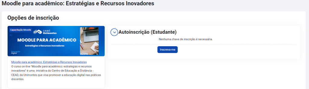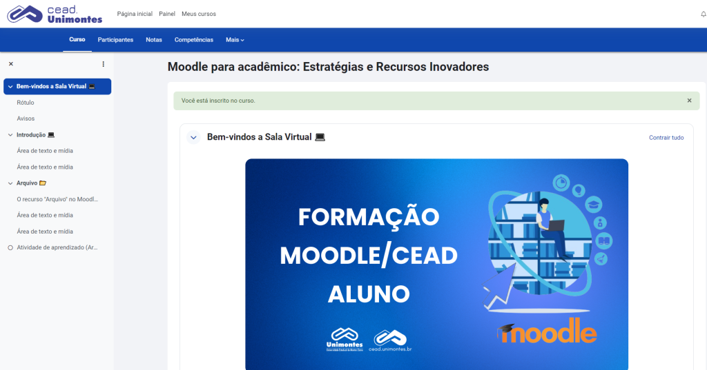 Ao clicar no botão “Inscreva-me”, você será automaticamente inserido e redirecionado para a Sala Autoinstrucional. A seguinte mensagem de confirmação aparecerá: “Você está inscrito no curso”. Explore a Sala Autoinstrucional para se familiarizar com o ambiente Moodle e aproveite todos os recursos disponíveis!