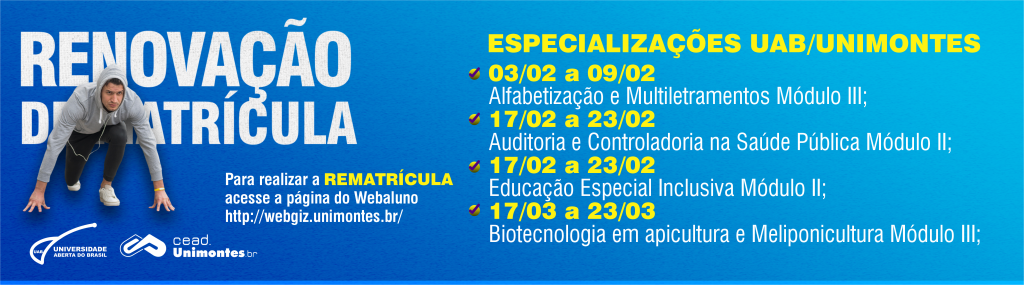 A Universidade Estadual de Montes Claros (Unimontes), por meio do Centro de Educação a Distância (CEAD), informa que o período de renovação de matrícula dos cursos de Licenciatura na modalidade a distância (UAB) ocorrerá entre os dias 28 de janeiro e 08 de fevereiro.