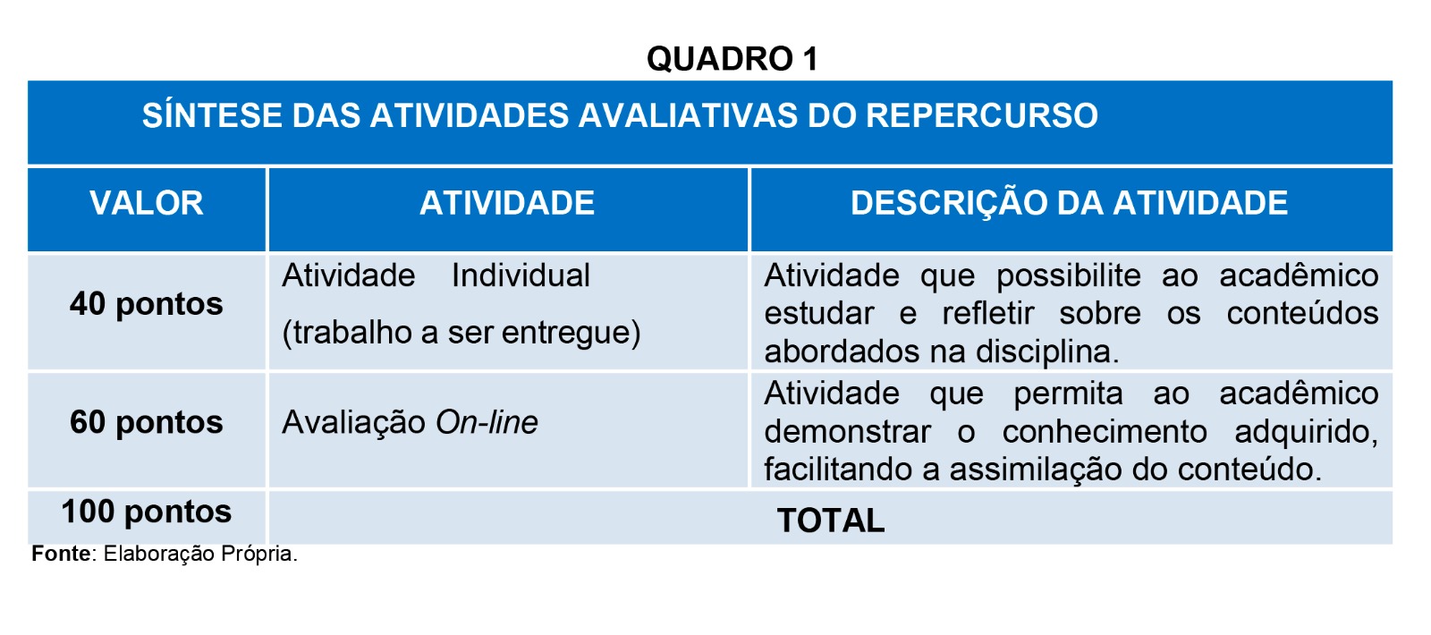 O projeto busca intervir no processo de ensino-aprendizagem, oferecendo uma solução para os acadêmicos que enfrentaram dificuldades relacionadas ao uso da plataforma de ensino a distância, falta de proatividade e até problemas de acessibilidade tecnológica. Ao participar do Repercurso, os alunos terão a chance de alcançar os requisitos mínimos de aproveitamento de 70% nas disciplinas e a frequência obrigatória de 75%.